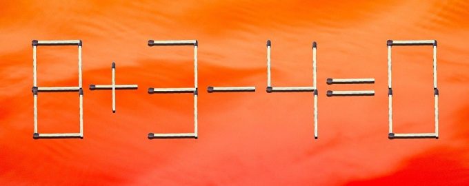 Štai 8+3-4=0 pavyzdys, kuris akivaizdžiai neteisingas. Jums tereikia perkelti vieną degtuką, kad užduotis būtų prasminga. Pagal tokių galvosūkių taisykles negalima nuimti pagaliukų nuo „=“ ženklo arba jo perbraukti, tačiau leidžiama keisti bet kokius kitus simbolius ir skaičius.